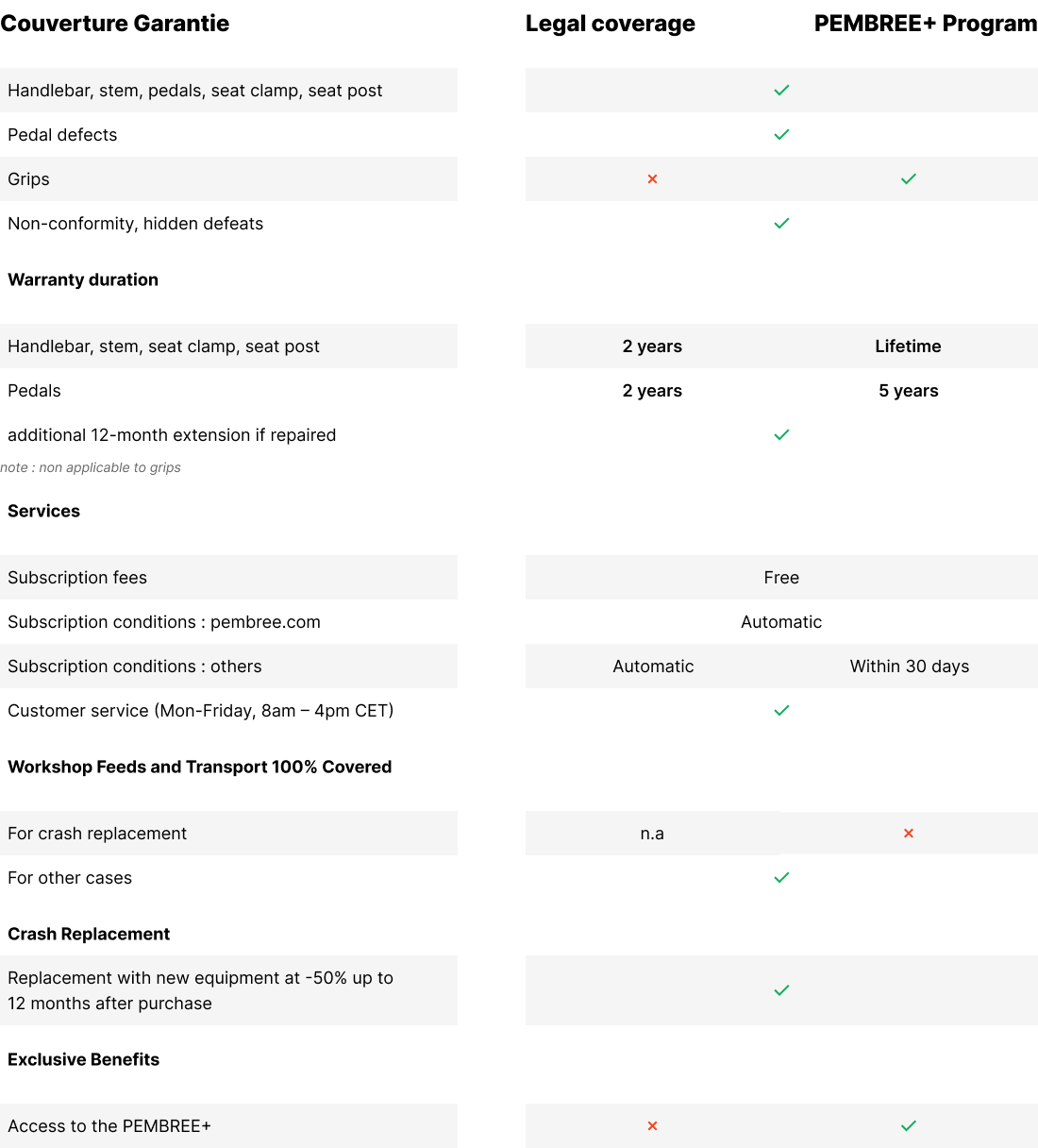 Le service PEMBREE+ Crash Replacement ne couvre pas l’usure normale ni les dommages liés à une utilisation inappropriée, mais il complète votre garantie pour vous offrir une sérénité totale lorsque vous en avez le plus besoin.